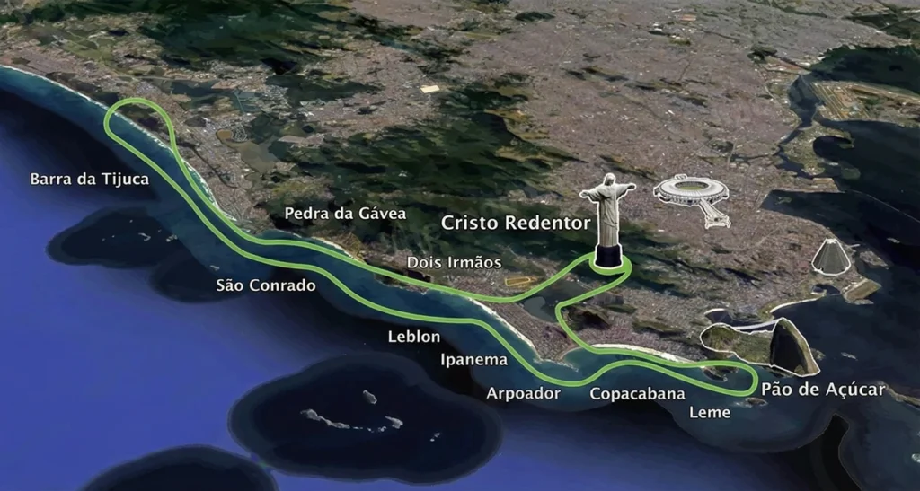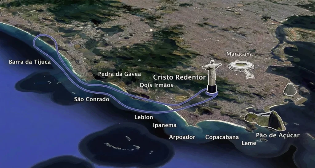 de Freitas, Jockey Clube, Floresta da Tijuca, Pedra da Gávea, São Conrado, Joatinga, Barra da Tijuca, Pão de Açúcar,